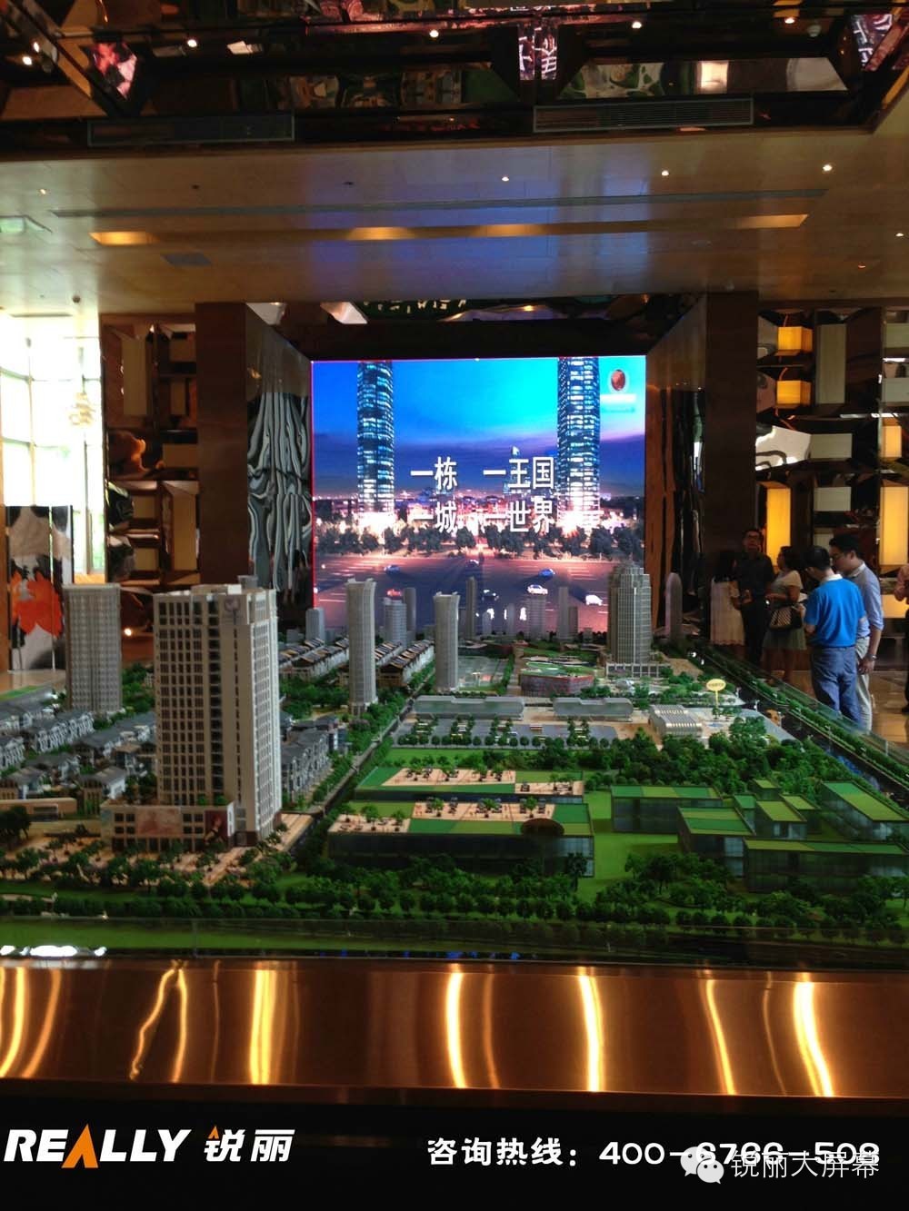 本售楼共中心配置了一套LED室内全彩大屏显示系统、一套音响和功放扩声系统,一套控制系统,整个售楼中心四周均匀的布置了8台音响,当人在售楼中心的任何一个位置都有被音乐包围的感觉,配合大屏播放的宣传片及园区实物沙盘更有身临其境的感觉。另外通过控制系统可以大屏可以播放不通的内容满足不同的应用需求。