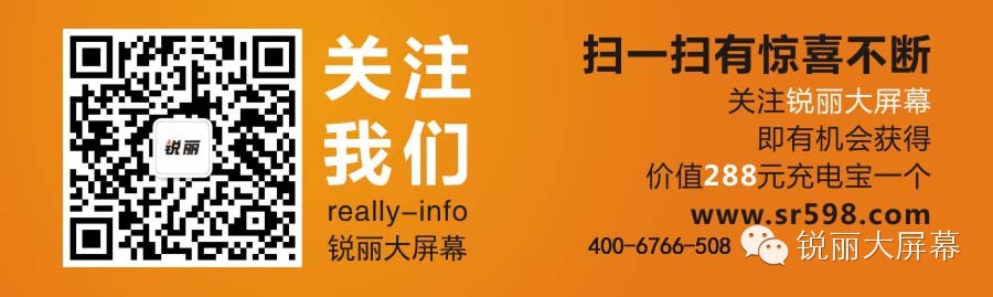 “锐 .所见即所得,丽.享显示的价值”。大屏幕显示随时随地出现在您的视角范围,我们将每周为您分享锐丽精彩的大屏幕应用案例!只要您关注,锐丽大屏幕就会给您带来意想不到的商业机会与价值。请您扫描下面的二维码,或者搜“really-info”“锐丽大屏幕”即可加入我们!