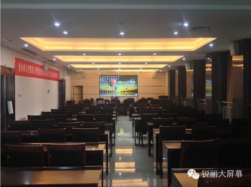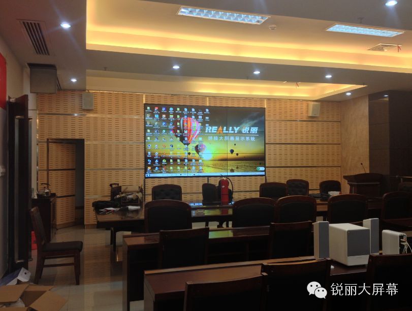 图为永州市政府多功能会议中心采用锐丽47寸液晶拼接单元以3行x3列拼接组成大屏幕。超高亮度、超高清、宽视角、多信号、多功能一体的培训会议中心。