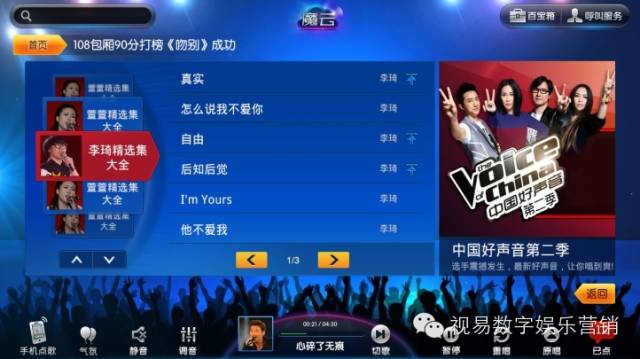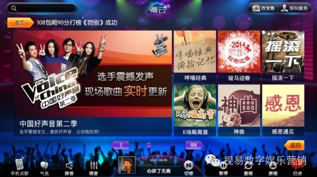 好歌曲、我是歌手II、好声音III等最新、最热的活动信息、图片、专题歌曲列表等一步到位,无人值守自动导入,让用户更快速点播潮流歌曲,让K场便捷开展专题活动运营,做潮人最爱的KTV!