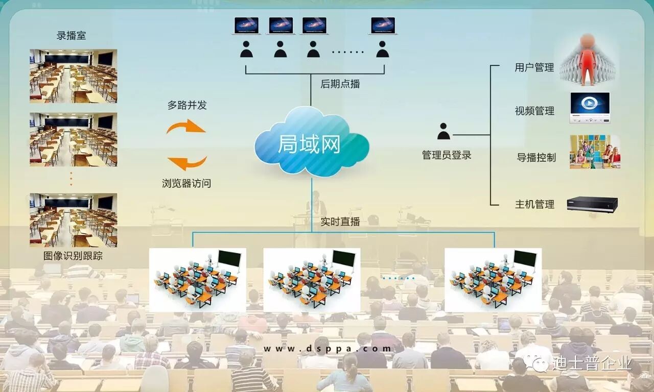 录播系统,作为当前主流的信息化教学系统工具之一,在“一师一优课、一课一名师”活动的开展实施中扮演了重要角色。迪士普教育云录播系统采用最新一代系统架构进行设计,跟踪系统创新性地内嵌在录播主机中。该系统摒弃了传统图像识别分析技术对辅助分析摄像机的依赖,突破性地采用全景拍摄摄像机进行图像识别分析,在简化设备提高稳定性的同时,并将图像识别分析精度提高到全高清1080P,系统整体框架更稳定,施工更简单,应用更普及。